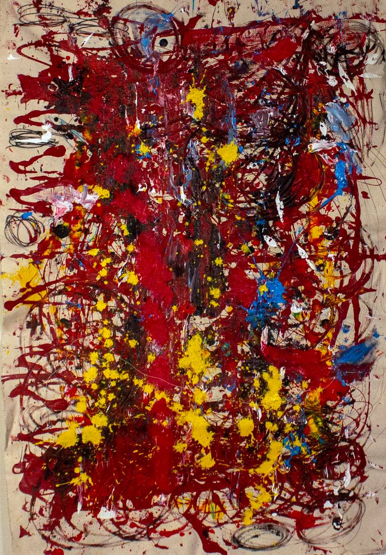 This abstract artwork, predominantly featuring the color red, was created on an unstretched canvas. This gives you the flexibility to hang it as it is, frame it, or stretch it as per your preference. The painting is a swirl of emotions, depicted through the brush strokes applied with quick, delibera...
