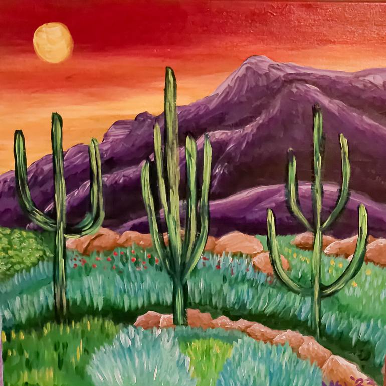 Original acrylic on stretched canvas painting inspired by southwestern natural beauty. Vivid colors were used in this painting to excite the eye and give a sense of happiness. Care of the painting requires an occasional wipe down with a damp cloth. Several coats of a protective varnish have been app...