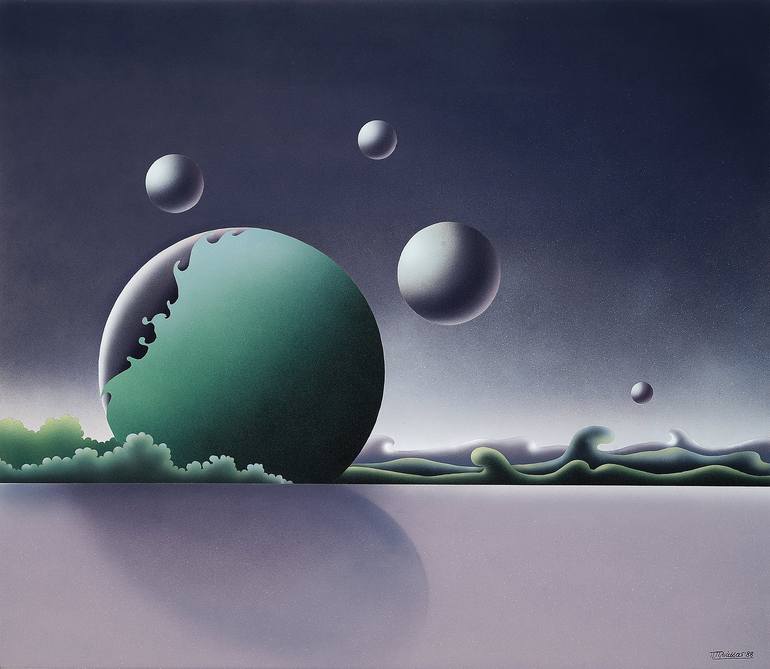 The eternity of the universe is linked figuratively with the landscape of our planet. As you look at this artwork you can feel and hear the sound of the alien universe. This artwork was created on Illustration Fine Art paper with acrylic colors combined with airbrush Paint, pencils and the Conceptua...
