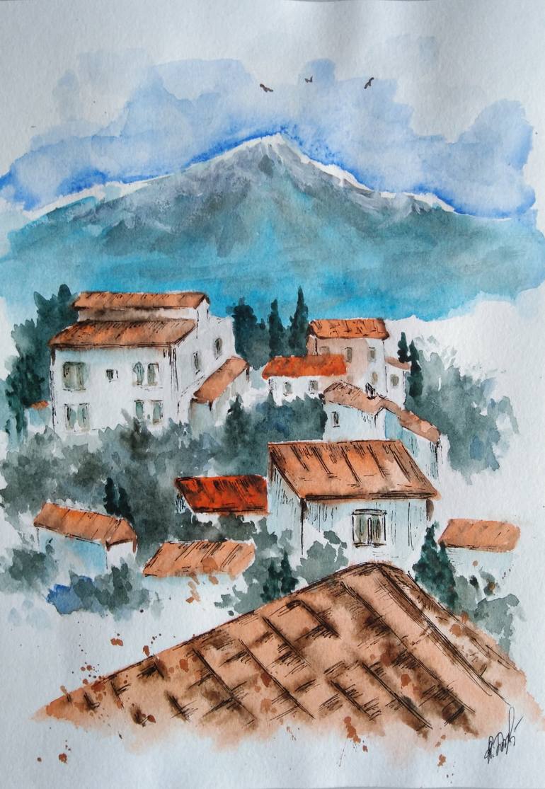 I love Italian streets. Therefore, I want to share with the audience the beautiful views of Italian houses, sunken roofs in cypresses, mesmerizing mountains... This work will look great in a simple wooden frame with a mat.