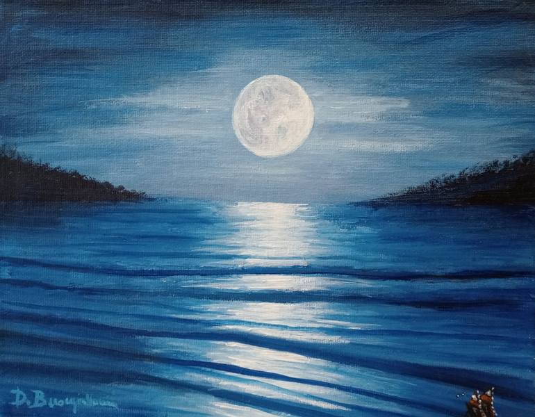 La notte e la luna protagoniste in questo dipinto. Mi affascina molto questo paesaggio così misterioso. Ecco perché ho voluto dipingerlo. La luna ci riscalda e ci fa compagnia come farebbe una persona cara. I colori sono ancora quelli acrilici