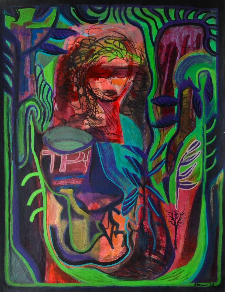 Multi layered organic piece natural figurative forms collide with a more urban street aesthetic. Elements of style and colour juxtaposed in contrasts. Feels witchy or magical.