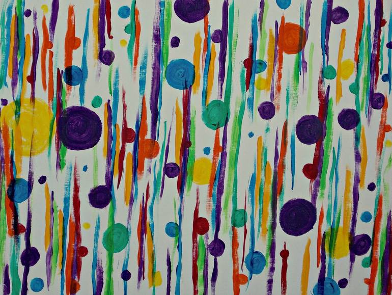 Acrylic paint on acrylic paper abstract painting representing different coloured spherical quantum particles floating and interacting amongst strands of atomic energy.