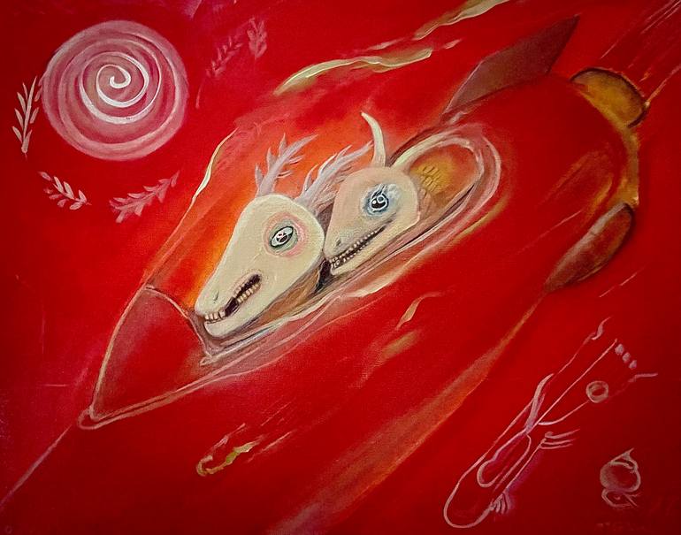 Executed in a dominant spectrum of red hues, this composition centers on an elongated, streamlined vehicle rendered in graded tonal transitions from crimson to vermilion, imparting depth and velocity. The fuselage contains two stylized, pale-hued heads with angular jaws and spiral-detailed eyes, mod...