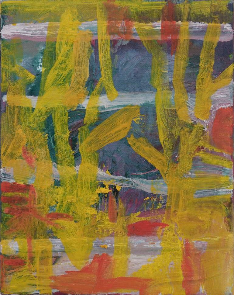 This small painting bursts with energy, packing an intense visual punch despite its compact size. The vibrant yellows and reds create a striking sense of intensity, while the flowing brushstrokes that spill over the edges suggest a feeling of motion and speed. The multiple layers, visible along the...