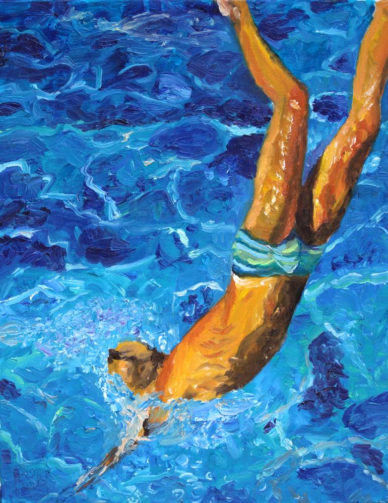 My first attempt at a new style with pure thick brush strokes to give energy and momentum to this vivid picture. My then 6 year old son diving full of confidence.