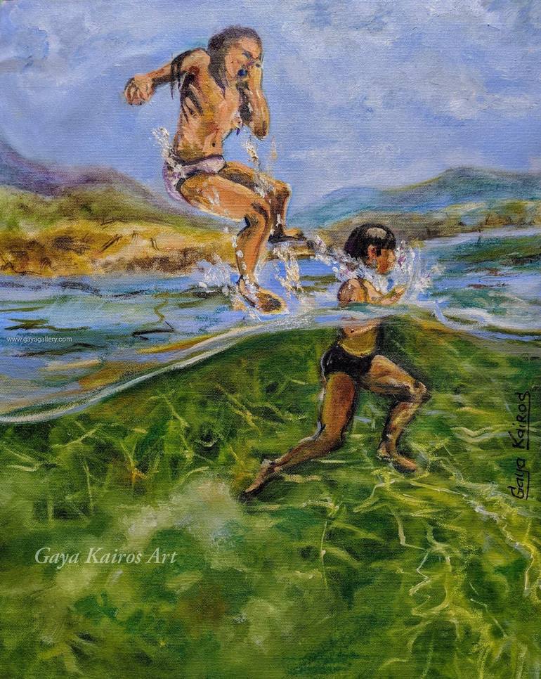 Children diving into sea on a backdrop of landscape with mountains with reflections and rays of light shining in the water. Oil on unstretched canvas will be shipped rolled in a tube and can be easily stretched and framed at your local framing store.