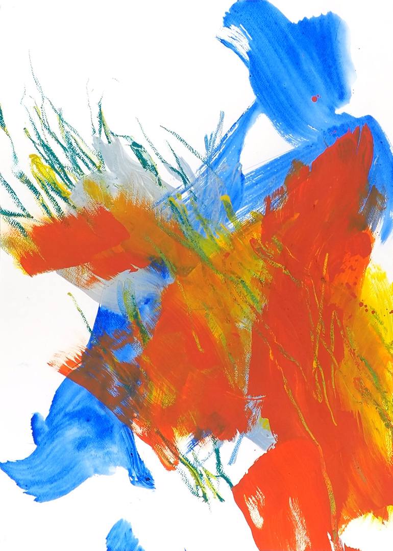 In the temporality of the gesture, I pace the surface and play with the chemistry of colors, with dominantesof blue and red, with lines of oil stick. I mix gesture, line and space. Acrylic paint and oil stick on watercolor paper.