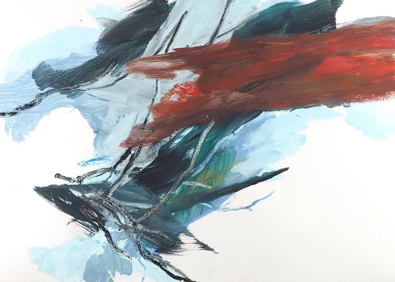 In the temporality of the gesture, I pace the surface and play with the chemistry of colors, with a background of white and blue, and touches of red and black. I mix gesture, line and space. Acrylic paint and oil stick on watercolor paper.