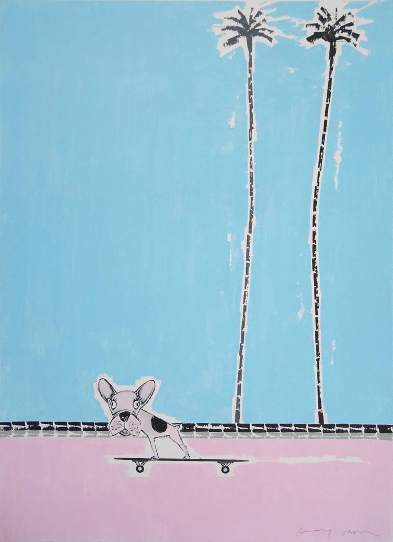 Spot The French Bulldog Skateboarding Down The Boulevard Acrylic and ink on paper 2018 Signed by Andy Shaw Ready for framing
