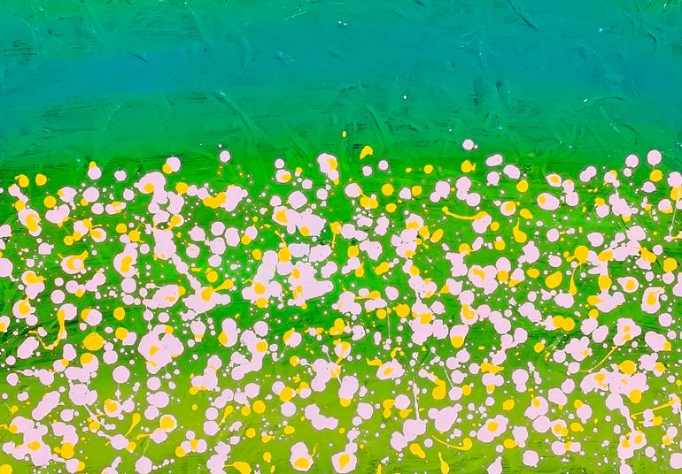"Spring Aesthetic" is an original abstract painting that captures the essence of a wildflower field in spring. Bright yellows and whites dance across a vibrant green background, creating a sense of joy and renewal. This modern wall art is an acrylic painting on canvas. Multiple layers of high-quali...