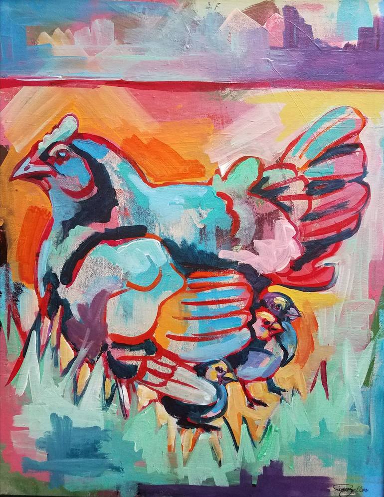"Spring Chicken" is a tribute to the renewal of new life. With the springtime comes the return of a jubilant season of rebirth and abundance. The world is bright to new eyes. The main subject, a mother hen gathering her brood, suggests that the viewer remanence a time when the Mother form offered ...