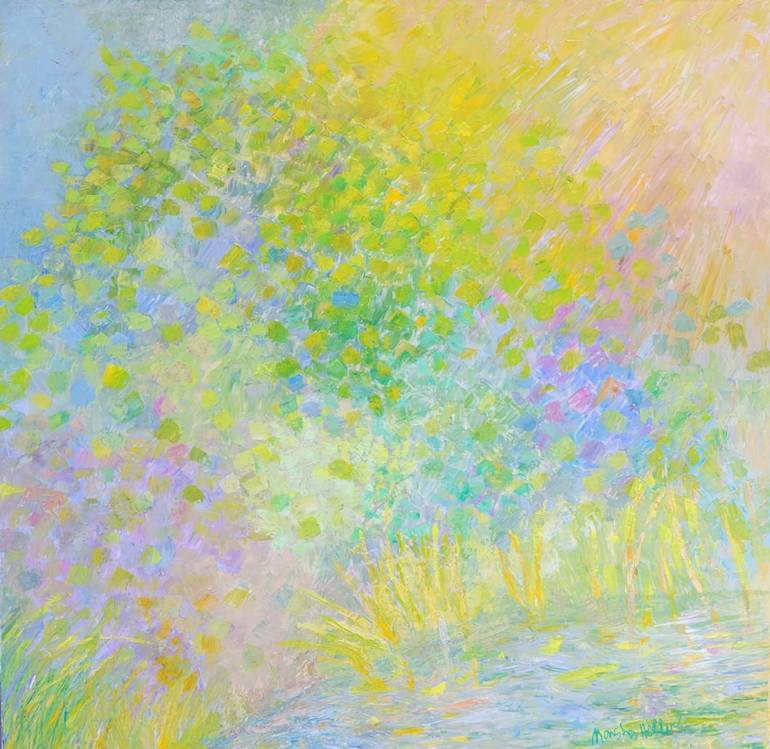An imagined scene of pastel colors in springtime came to me from my love of spring and new growth. I used a palette knife and oil paint - oil paint for the subtlety and my palette knife for the ease of application. I hope to elicit a smile from the viewer who chances upon this painting. It is framed...