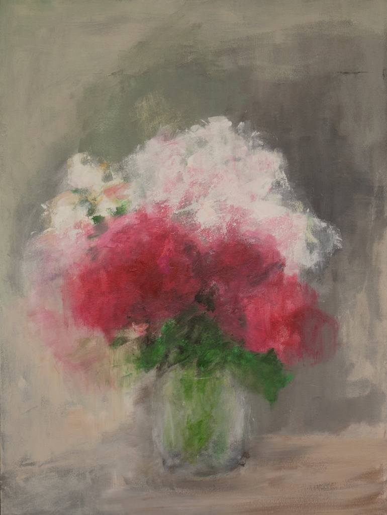 Large impressionistic painting of flowers. High quality gallery wrapped canvas with 1.5" deep stretcher bars, sides painted in black - no framing required. Canvas will arrive wired ready to hang.