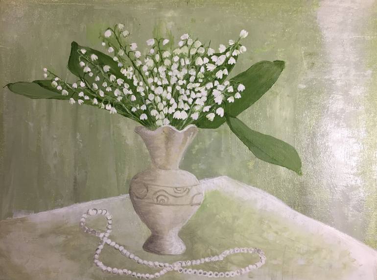This elegant oil painting captures the delicate beauty of white lilies of the valley arranged in an ornate vintage vase. The soft green background enhances the purity and freshness of the flowers, evoking a sense of tranquility and nostalgia. The carefully detailed pearl necklace adds a to...