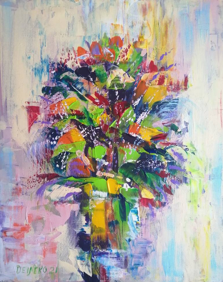 "Adore painting women, flowers, and seascapes! These are all my true inspiration". Valerie Kraplia is an artist from Ukraine whose works explore woman life, togetherness & solitude, personal transformation, motherhood & personal memories, and also nature as a comforting serene ambiance inspiring for contemplations. The artist also adores creating floral still lives. She primarily works in a semi-abstract manner, combining expressive abstract thick bold strokes which give extra vividness and expressiveness to paintings with finely elaborated features. The artist loves experimenting with mixing colors, playing with textures and tools. She admits that despite using many different tools (brushes, plastic cards, film wrap, forks, napkins, her own fingers, cotton buds, and many others) her best-loved pick and real fav is a palette knife. Valerie says, "it allows creating the textures I myself love touching with hands and eyes to give those rich paintings further to you".