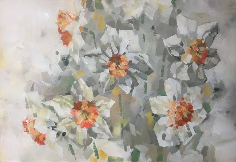 A bouquet of beautiful spring garden daffodils. The picture is made in mother-of-pearl silver tones with large expressive strokes, as if conveying the freshness and lightness of early spring. The picture is made with acrylic on watercolor paper Canson (300 gr). #flowers #bouquet #interior #home #nat...
