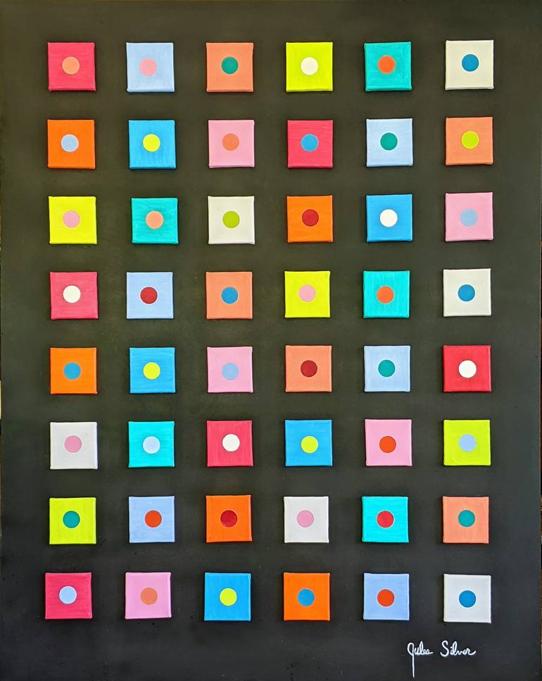 It's finished, signed and ready for delivery. Size 60 x 48 x 2. Each 4 inch square is an individual canvas that has been painted with acrylic paint in bright colors and some in neon colors. The contrasting dots are of paper and painted with acrylics. The background is black canvas making the square...