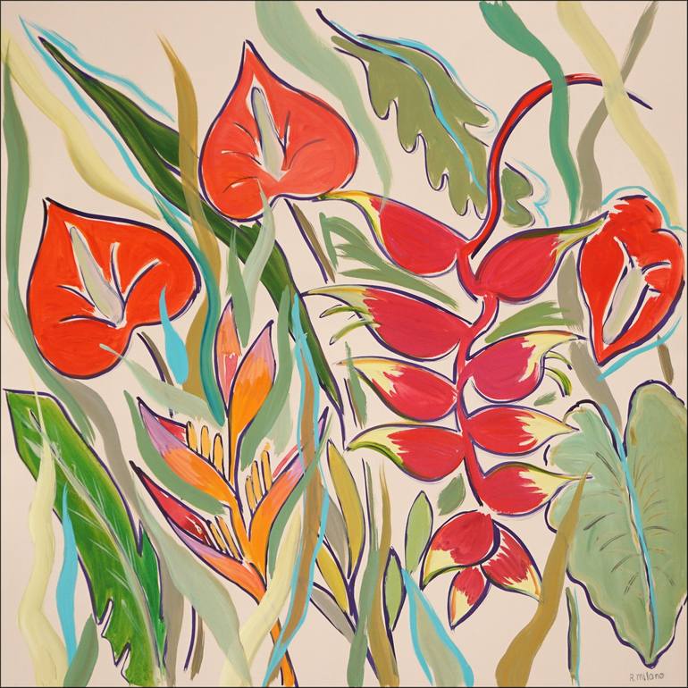 "Squared Tropical Garden I" is an abstract expressionist painting by Romina Milano where a dance of black gestures unfolds across colorful brushstrokes infused with raw emotion. Romina Milano is an Italian artist renowned for her paintings that are primarily composed of strong gestures, vibrant co...