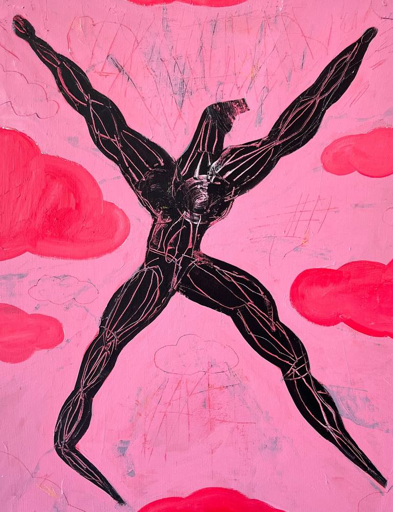 Sinisa Janjic aka Primitive RE, is a self-taught contemporary artist based in Belgrade, Serbia, working with acrylics, oils, oil sticks, spatulas, pencils, drawings, and whatever tools he finds in his studio. His work is marked by bold forms, vibrant colors, and deeply personal narratives. He approaches his abstract and figurative work as an energetic output process, using palette knives and spatulas for mark-making, and encompassing personal stories, everyday life, struggles, and triumphs. The use of bright colors, particularly pink, juxtaposed with dark, assertive lines, evokes both vibrancy and conflict, creating a dynamic tension between softness and strength. Current exhibition with Colonna Contemporary /Lung-Head Man/