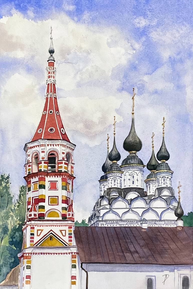 The two connected churches - one for summer services and one for winter - were built in 17-18th centuries and now stand out among all churches of Suzdal, Russia, for the colourful decor of the bell tower. This view required using color media, so I chose Schmincke watercolors to match with Fabriano A...