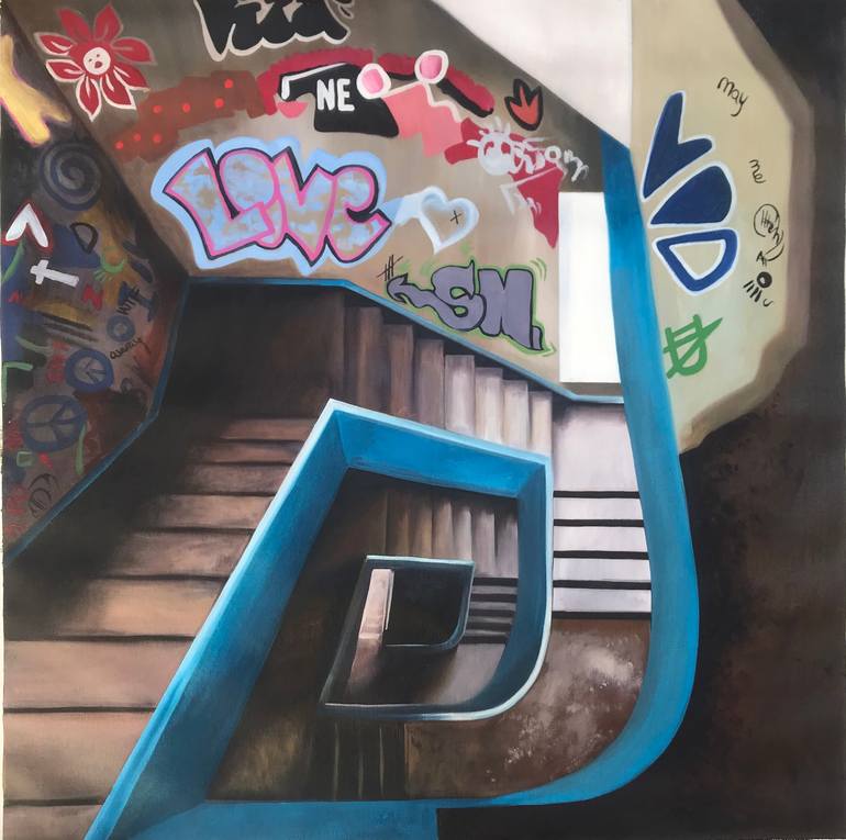 In this painting I created a space where color, light and graffiti works together making a introspective and misterious atmosphere.
