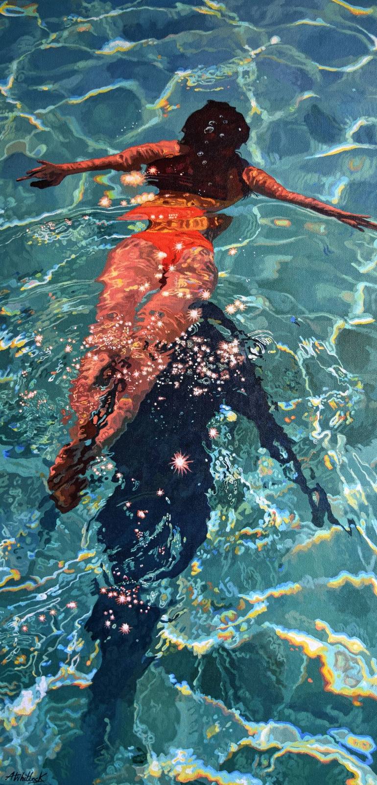Abi Whitlock's work focuses predominately on the human form and how the mind and body are affected when immersed in water. This is mirrored by the way light is refracted and reflected, distorting and enhancing colour and shape. Whitlock captures the way entering the water enables the swimmer to enter an altered state of mind; a form of escapism from the real world. Her inspiration comes from a recent move to coastal Devon, trips to the beach and outdoor pools. The way she works puts great emphasis on minute detail. This imparts every aspect of the painting with value and depth which in turn gives the observer the sense that they themselves are becoming immersed along with the swimmer. Although Whitlock works in a hyperrealist style; the way she paints water creates natural abstraction within her pieces. Water and its interplay with light generate unusual, distorted and complex patterns, altering the perception of everyday images.