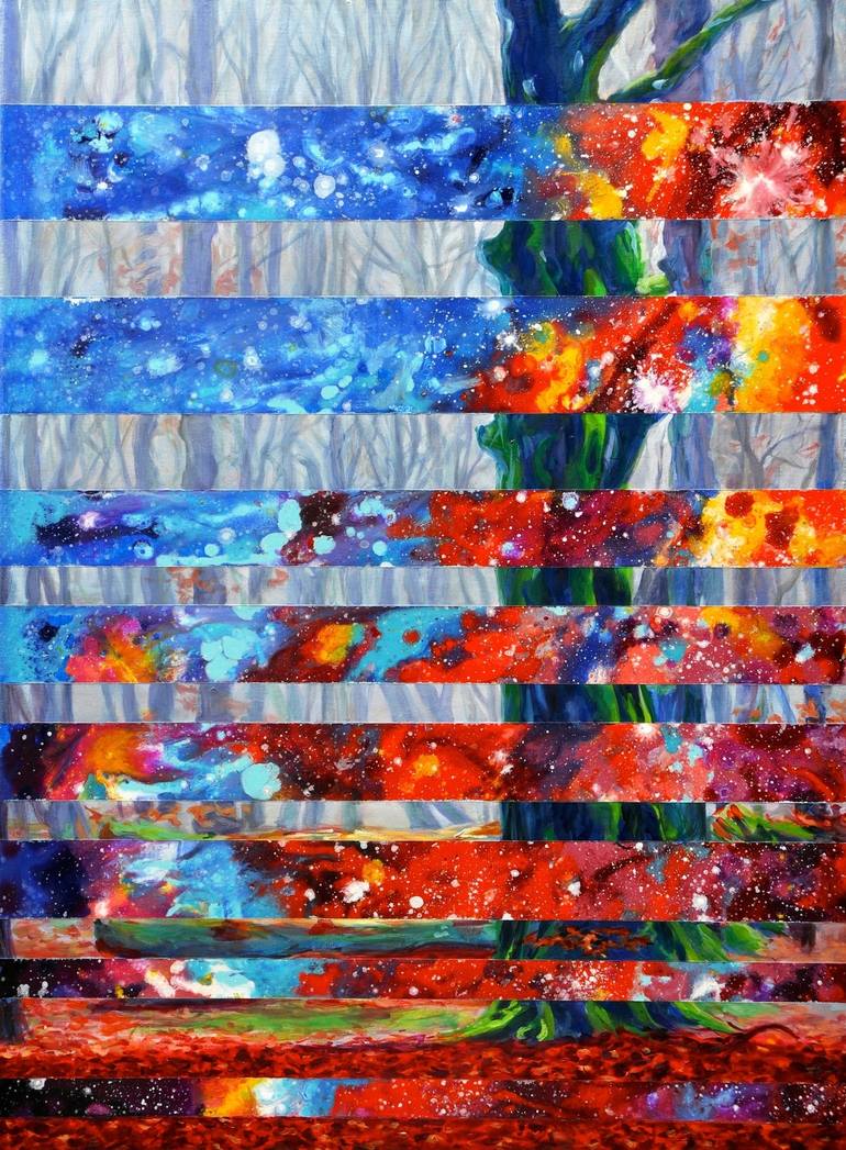 A verdant forest spliced with a star forming nebula, this oil painting bursts with life. The nebula sections use a splattered chaotic technique to offset the carefully grown forest. This strikes me as a good metaphor for life arising out of random violent interactions. The painting is on heavy du...