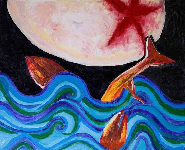 Depiction of ocean scene, three fishes between the waves with a starfish in the moon, rough brush strokes, colours mainly blue, green and black, some brown and red/flesh/white.