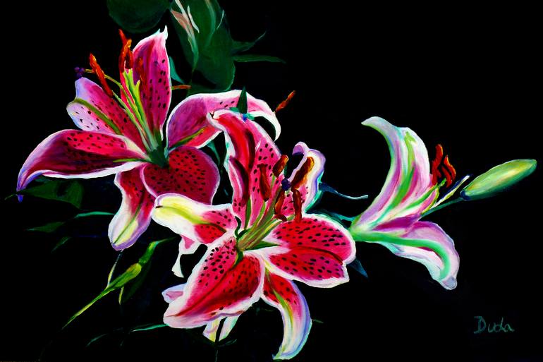 These are three of the Stargazer Lily's from a bouquet that was part of a centerpiece from my Mother and Father's 50th Wedding Anniversary Party. What a beautiful thing...Three cords tied as one. God, Man and Woman. Three Stargazer Lily's become the stars of this black as night background.