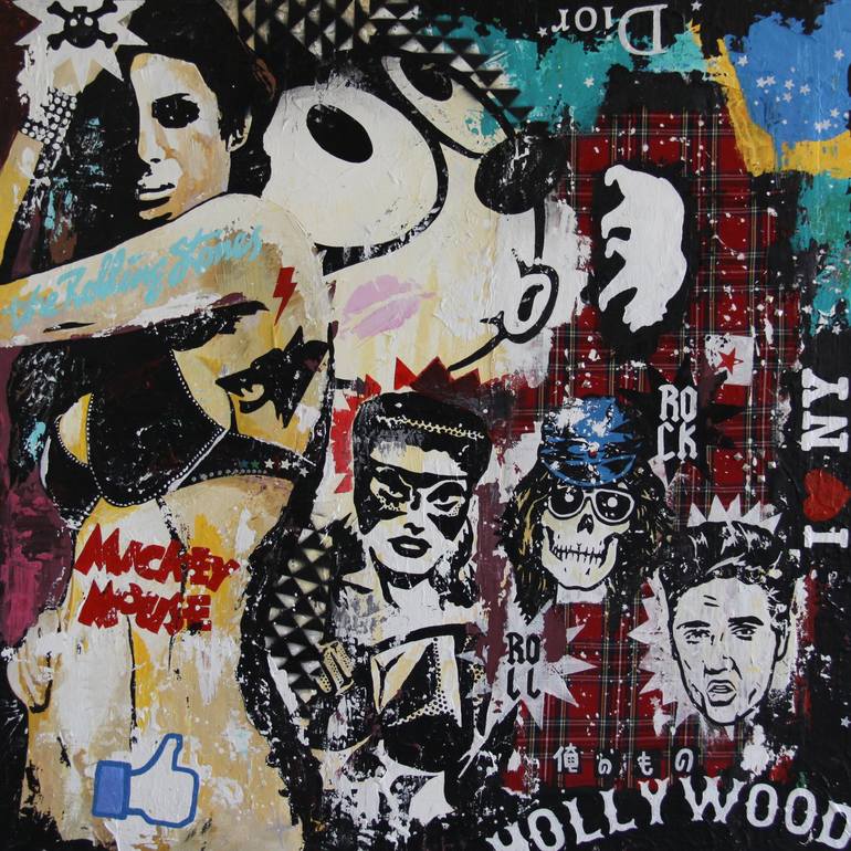 A stunning Pop Art acrylic painting with a Rock and Roll twist and embellished with tartan material and metal studs. The canvas edges are painted black, so no need to frame.