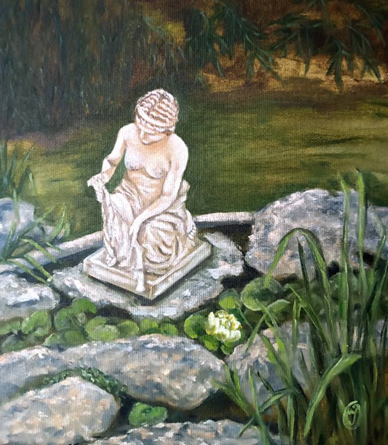 The painting depicts a white marble statue of a girl rinsing cloth in a lake. The painting is painted with oil paints on canvas stretched on cardboard. This painting can be framed to your liking or placed on a shelf without a frame.