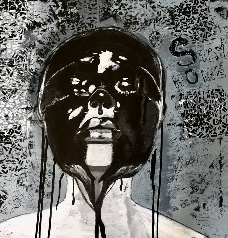 This painting was achieved in 2020 when the pandemic struck. It depicts a feminine portrait covered with black paint symbolizing the" untouchable face". I used acrylic paint and a stenciled background.