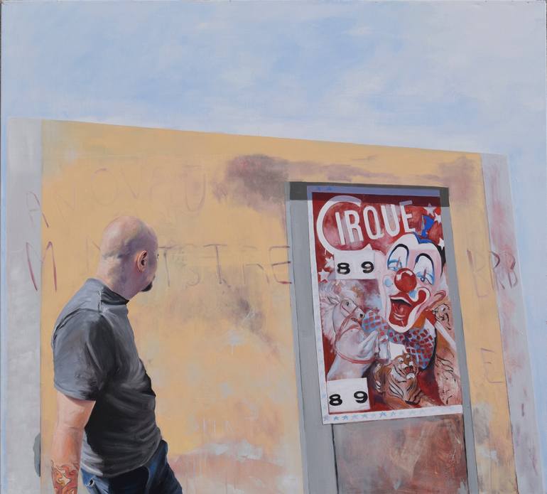 In Steve Goes to the Circus, Chris Stevens presents a compelling exploration of identity, irony, and visual culture. Set against a sun-bleached wall, the painting captures a bald, tattooed man Steve glancing over his shoulder at a circus poster plastered to the wall. The scene is quiet, even mundane...