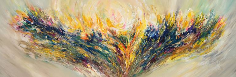 Large abstract painting. Original abstract expressionism art. 78.8" width x 25.6" height x 1.5" depth. (200 cm Breite x 65 cm Höhe x 3,8 cm Keilrahmenstärke) Yellow, magenta, pink, blue, green, orange, brown, white. Modern, awesome abstract artwork. It was painted with professional acrylic paint o...