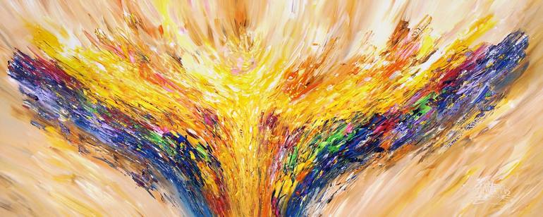 Painting: Acrylic on Canvas. Large abstract painting. Original abstract expressionism art. 78.8" width x 31.5" height x 1.5" depth. (200 cm Breite x 80 cm Höhe x 3,8 cm Keilrahmenstärke) Original painting. This artwork exudes liveliness and dynamism as well as harmony. The appealing color formatio...