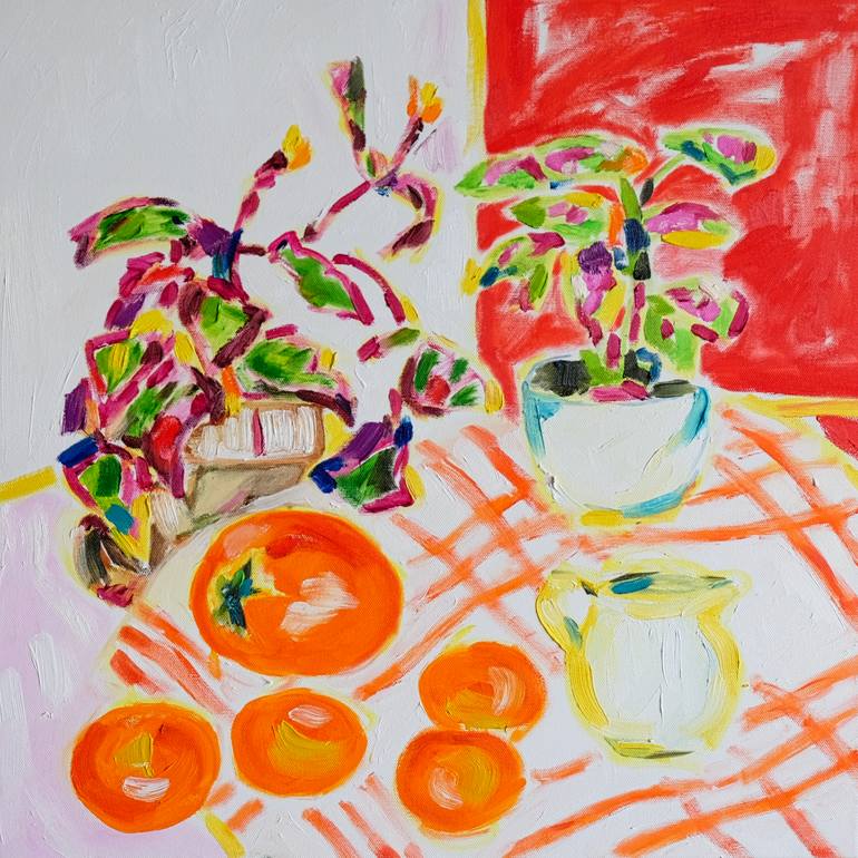 Still LIfe with a Persimmon and Mandarins is a contemporary still life in bright colors, orange, white and red. Houseplants and fruits, gallery wall painting, din room wall art, art gift.
