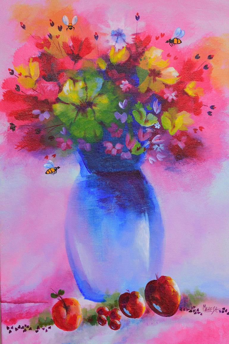 A vibrant blue vase holds a lively bouquet of colorful flowers, set against a pink background. Bees are buzzing around the flowers, and a few apples are scattered at the base. Best gift for her, Wall art, unique artwork. Size – 12x18 Inches. Ready to hang. Shipping in Box. Semi Abstract, Original ...