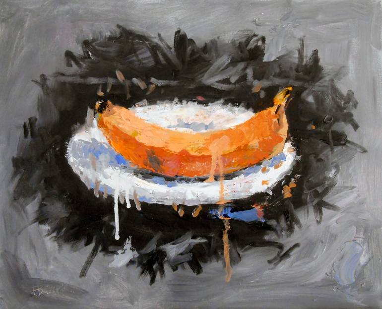 Still life painting of a banana on a plate. Painting is done in an expressive drippy manner. Part of my Dish series.