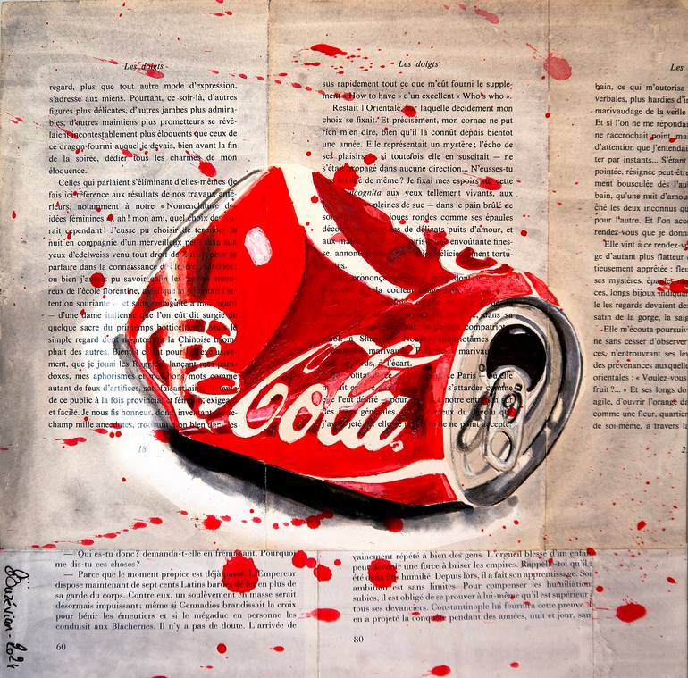 ⭐Coke Starwars ⭐ Smashed Coca Cola with red drippings Technique: oil, acrylic, and ink on old book pages on wooden frame 30x30cm ■■ 11,8x11,8 inch ⭐Sustainability⭐: Wooden frame is made by the artist by recycling old books. In an ecological approach, each packaging is tailor-made and is itself fr...