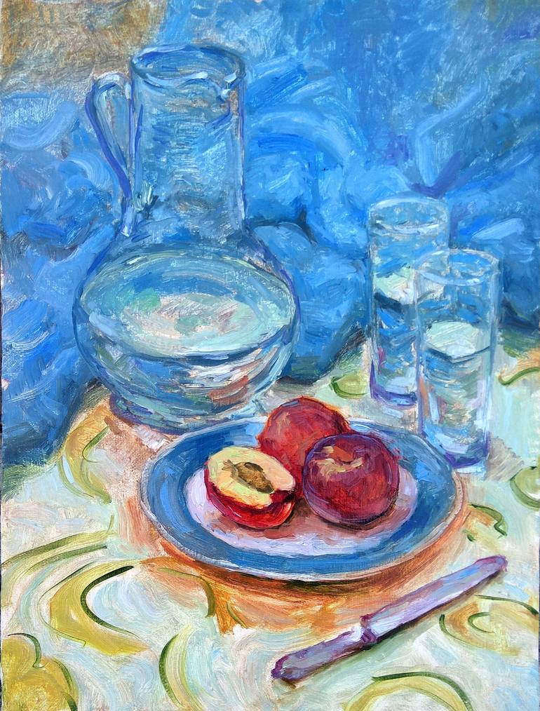 A still life with peaches and a glass of water on a blue drapery. I've painted it from life on summer, 2017.