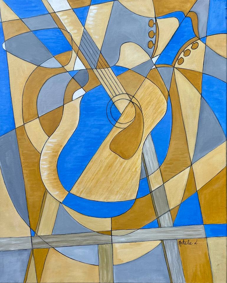 The artist has always been fascinated by the cubist movement which inspired her for this composition. The artist had fun fragmenting and representing her daily world, the Epiphone guitar offered by her husband Art, a painter's easel, a guitar pic and the palette she used to paint before integrating...
