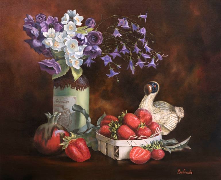 "Still Life with strawberries and a figure of a Dodo bird" classical painting in a realism-style, original artwork, 2018, painting oil/canvas. Painting