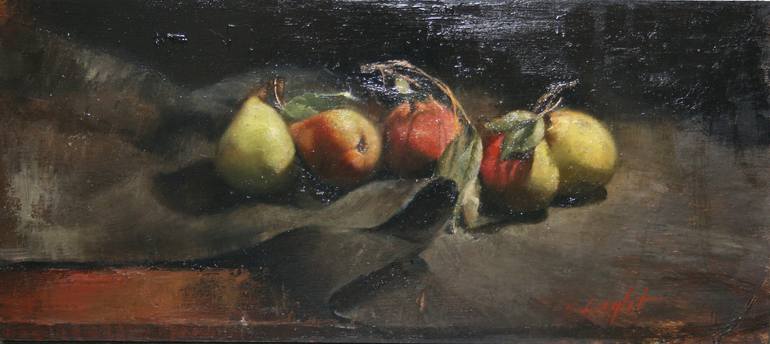Still life oil painting of pears. Oil painting on panel with varnish. The size is 10x22.