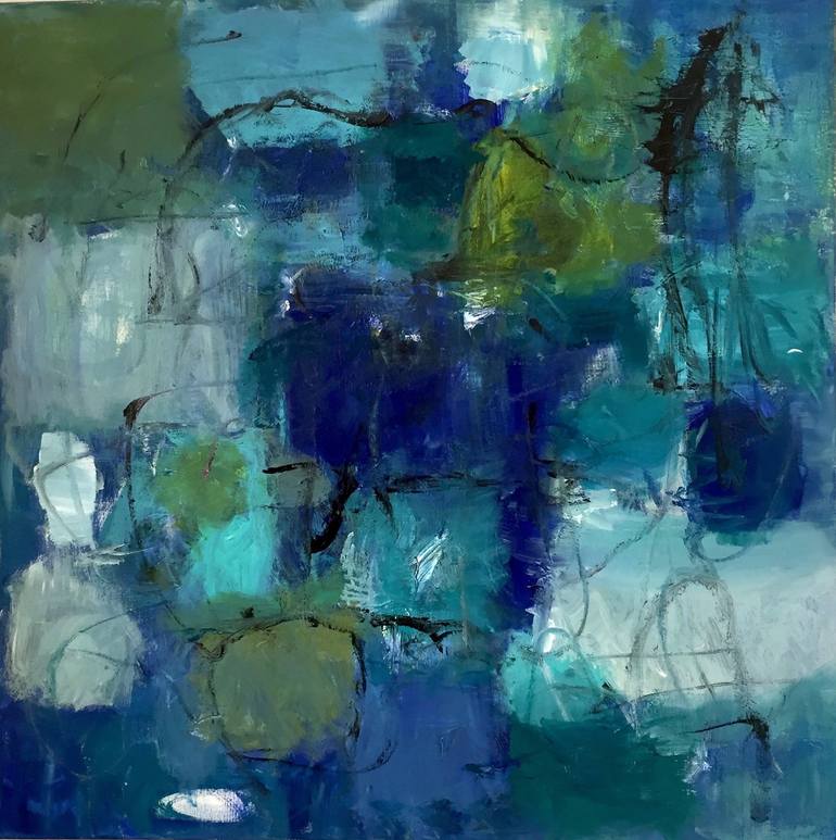"Still Waiting for You" is a vibrant painting on canvas with the main colors blue, turquoise and green in different shades. The work is done with acrylic colours on canvas and signed on the side. The sides are also painted in blue. It is ready to hang. The image in context is not to scale it is f...