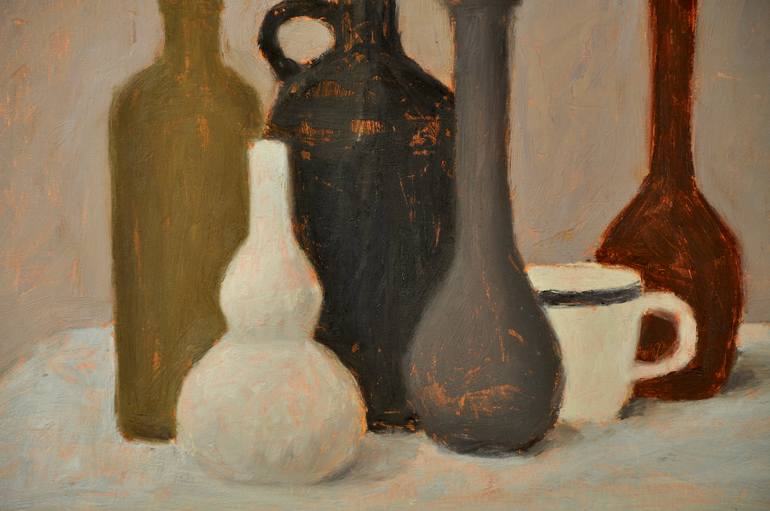 Oil on canvas board. This is an ongoing series of still lifes in which I pursue the use of a limited, earthy palette. These static and subdued paintings are meditations on the harmonious unity of contemporary conflicting individualities. My work on still lifes begins by browsing antique shops and ...