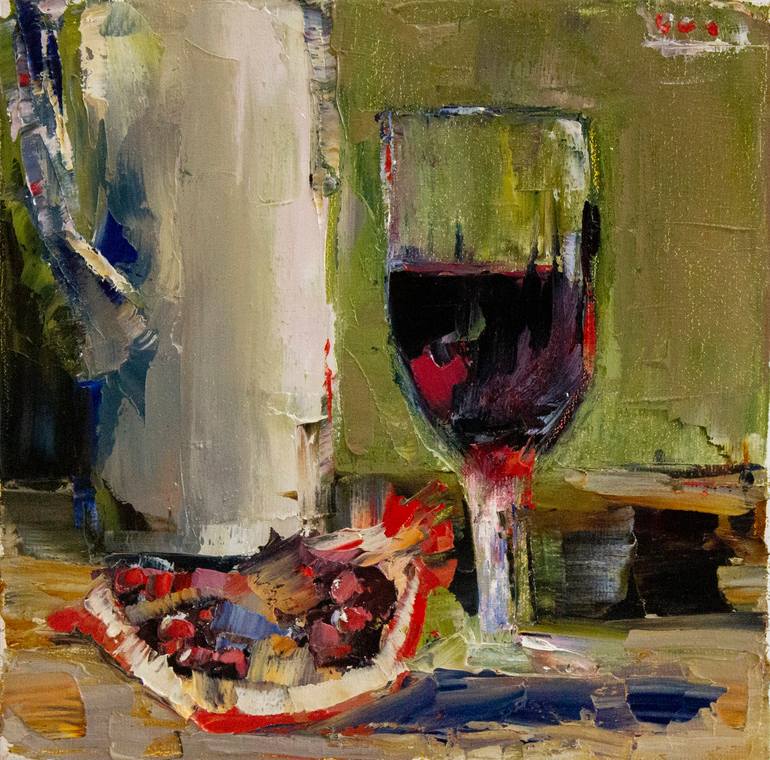 Original oil painting. Still life of a glass of wine and a ripe pomegranate. The size of the picture is 20 by 20 cm. A beautiful, bright and juicy composition will decorate and complement your interior. ============================================= PAINTING ON CANVAS The palette knife gives my dra...