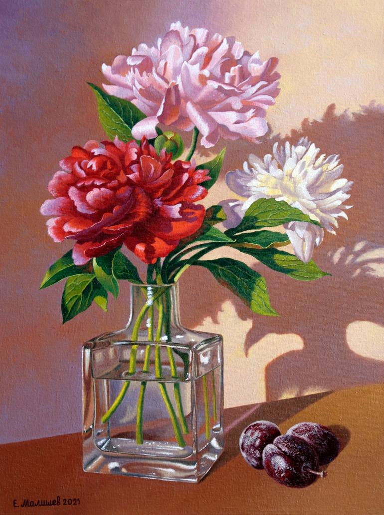 He began to collect the still life. I put a vase with peonies on the table, put different flowers in the vase, finally settled on the last option, and something was missing ... And then I put three plums next to the vase with peonies, and everything turned into a beautiful still life. To write my wo...