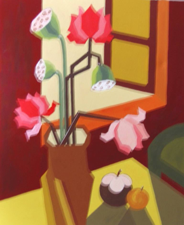 Still life of red lotus Still lifes of vases and simple fruits in the house that the artist knows how to breathe into the paintings are really beautiful, and give the viewer a feeling of lightness and purity.Hanging still life with vases and simple fruits in the house brings many joys to you, will b...
