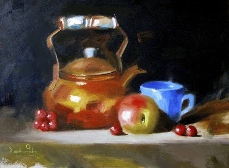 Still life painting 1, Oil on Canvas is available, Cup, Apple & Cattle